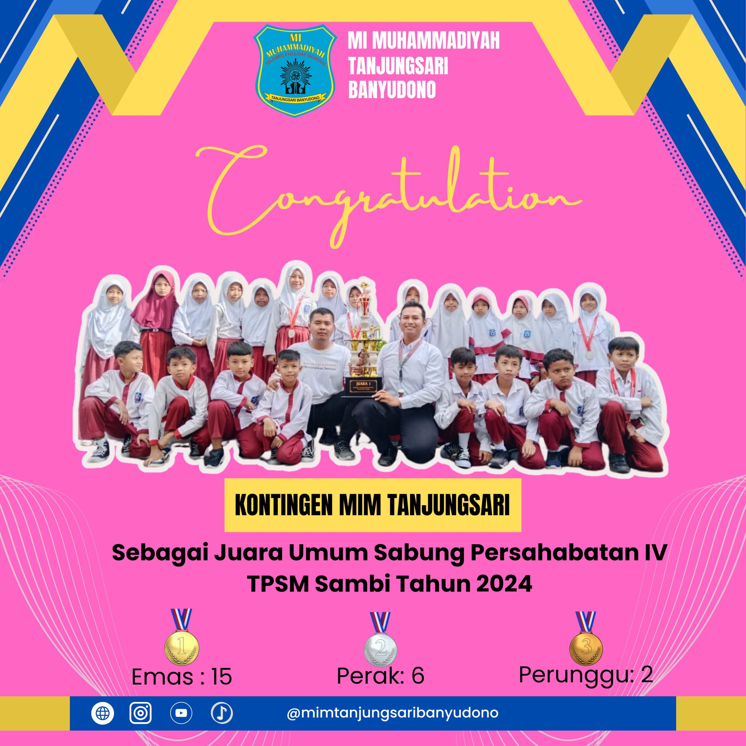 Alhamdulillah… puji syukur kami panjatkan kepada Allah SWT berkat rahmat-Nya MI Muhammadiyah Tanjungsari Banyudono (Muhtansa) meraih juara umum untuk ke 2 kalinya secara berturut turut. mengrimikan 23 pendekar dan semuanya mendapat mendali diantranya: 15 emas, 6 perak, dan 2 perunggu.